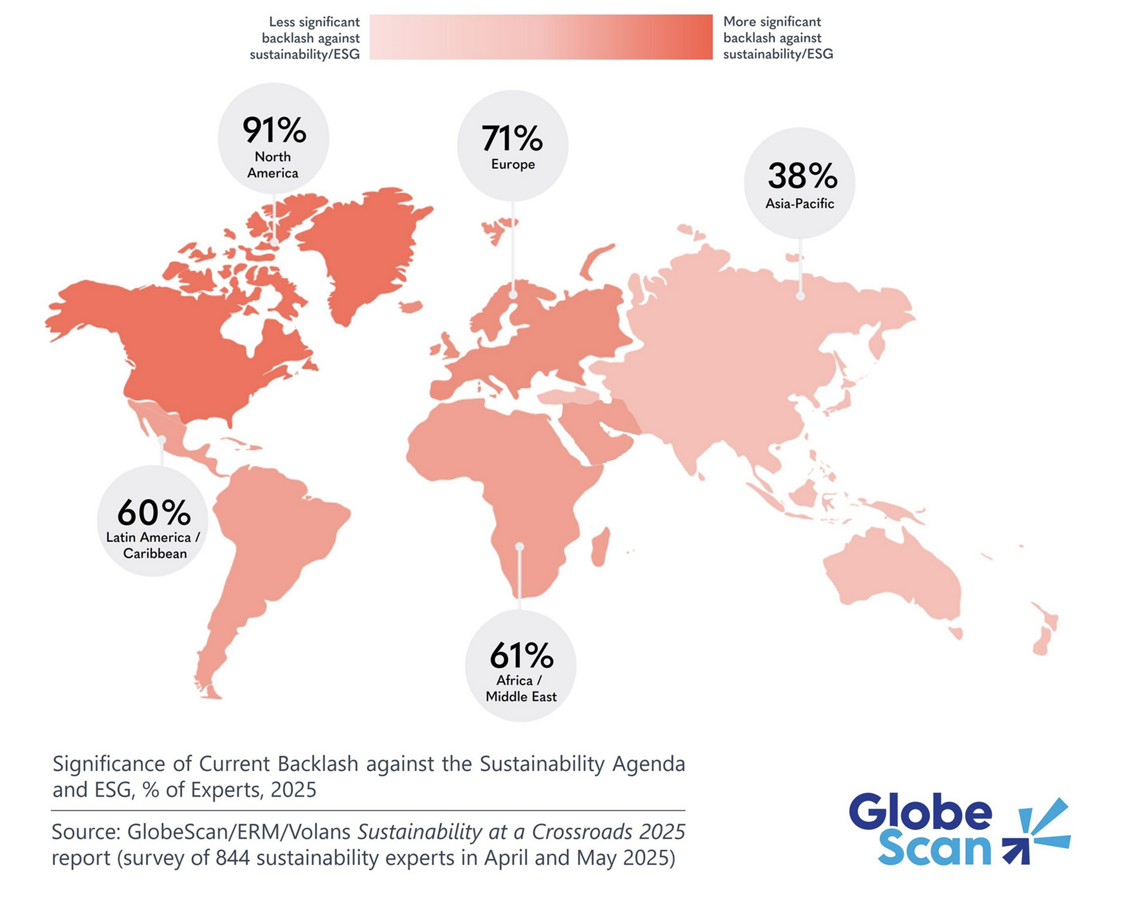 Les ambitions en matière de développement durable sont-elles en berne ? Toujours est-il qu’un fort climat d’incertitude pèse sur son agenda, alimenté par un vent de critiques toujours plus audibles. Les spécialistes qui évoluent dans le domaine témoignent en grande majorité d’un phénomène de rejet sur ces questions. Selon une étude récente menée par GlobeScan, ERM et Volans, ils sont 71 % a en attester en Europe. Logiquement, c’est en Amérique du Nord, berceau de ce backlash décomplexé sévissant dans le sillage de l’élection américaine, que ce phénomène est le plus observé, à 91 %. Si la vague est plus relative en Asie-Pacifique, elle semble déferler sur le Vieux Continent.