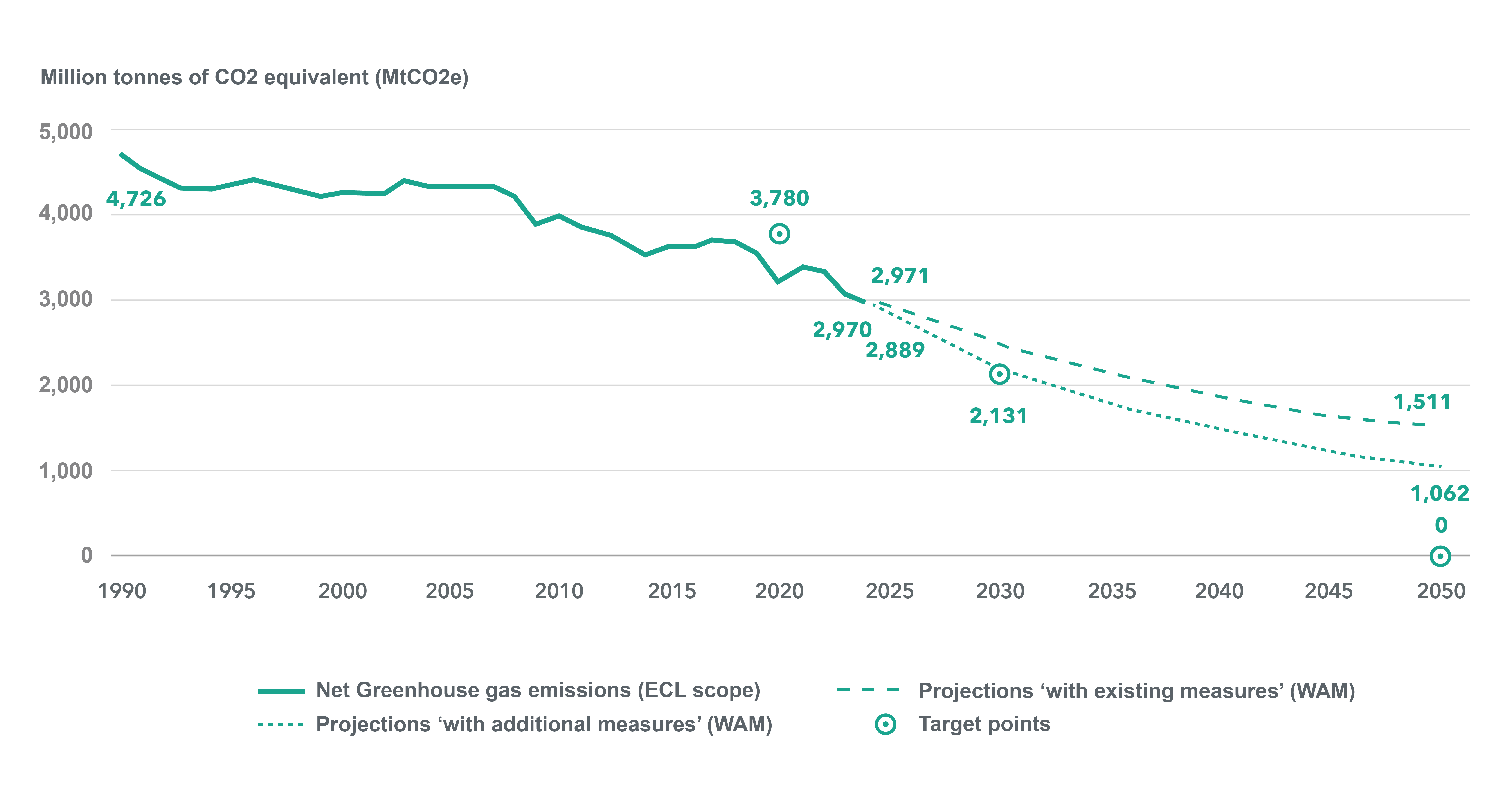 Si le défi reste immense, certaines données attestent de la pertinence des efforts entrepris. Ici, évolutions passées et futures des émissions nettes de gaz à effet de serre pour l’UE‑27, accompagnées des principaux objectifs pour 2020, 2030 et 2050.
