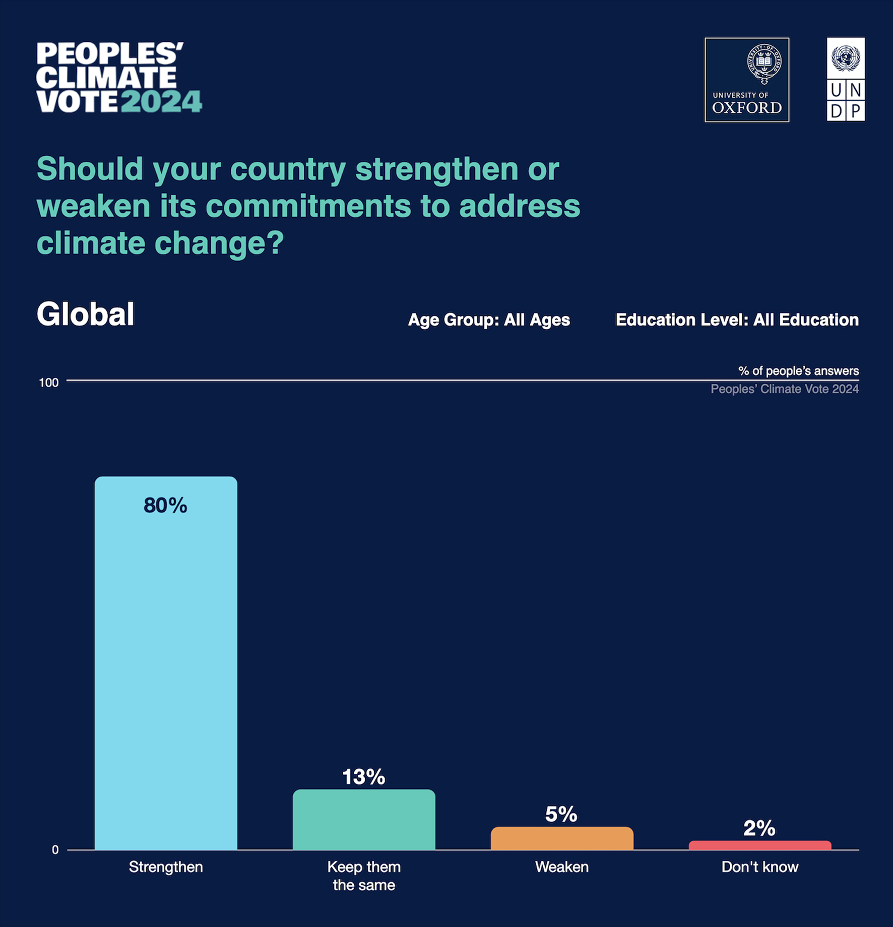 Selon Peoples’ Climate Vote, la plus vaste enquête d’opinion sur le climat au monde sondant plus de 73 000 personnes à travers 77 pays en 2024, la population se montre de plus en plus inquiète face au changement climatique (53 % se déclarent davantage inquiets que l’année passée). Plus encore, 80 % des répondants souhaitent un renforcement de l’action de leur pays sur ce sujet (89 % dans les pays en développement) et 72 % appellent de leur vœux une transition rapide vers les énergies renouvelables.